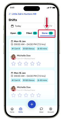 You will receive a notification when a shift is done and timesheet is submitted. Completed shifts can be found in the "Done" section under the "Shifts"tab.