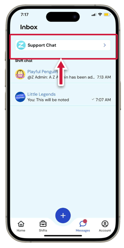 When you tap on the inbox tab in the main menu, the Support chat button will appear at the top. Tap on it to start chatting with a member of the Z team.